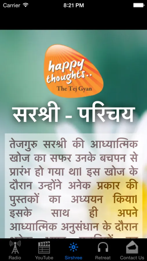 Tejgyan Global Foundation introduces "Tejgyan" Hindi (ads free) internet radio. Our free internet radio helps you to discover your beautiful inner being and understand karma, humanity and gain self realization - all on your mobile or tablet device. Join thousands of others in implementing Sirshree's teachings in your life: