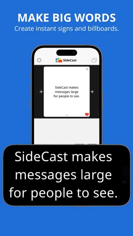 With SideCast™, easily enlarge typed messages on your iPhone or iPad screen, making it easy for others to see and read them from a distance. Write your message with text or emojis, then rotate your device to SideCast it to anyone nearby. This is the must-have messaging app for anyone who needs to communicate with someone silently, privately, or from a distance. The clearest messages are seen, not screamed. Save your voice, download SideCast today for free and start communicating more effectively.