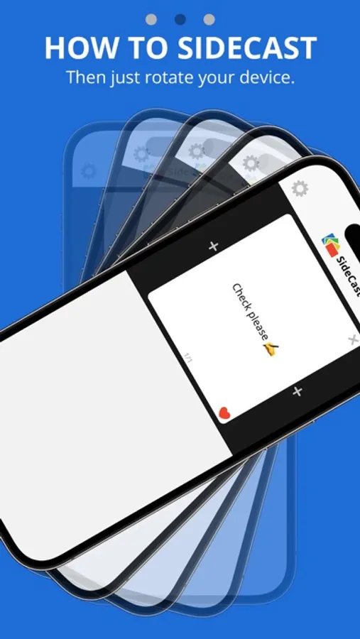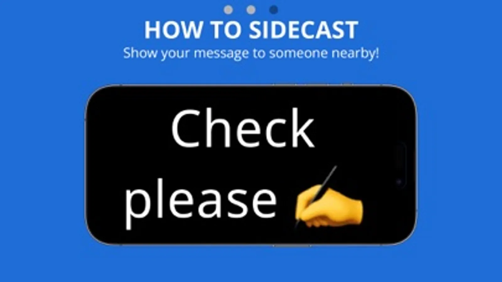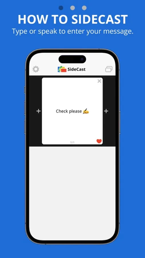 The options are limitless. Whether you're trying to get someone's attention, share a funny comment, or just want to say hi, SideCast makes it easy. Simply type or speak a message, then rotate your device onto its side to communicate with anyone nearby. Try it now, FREE!