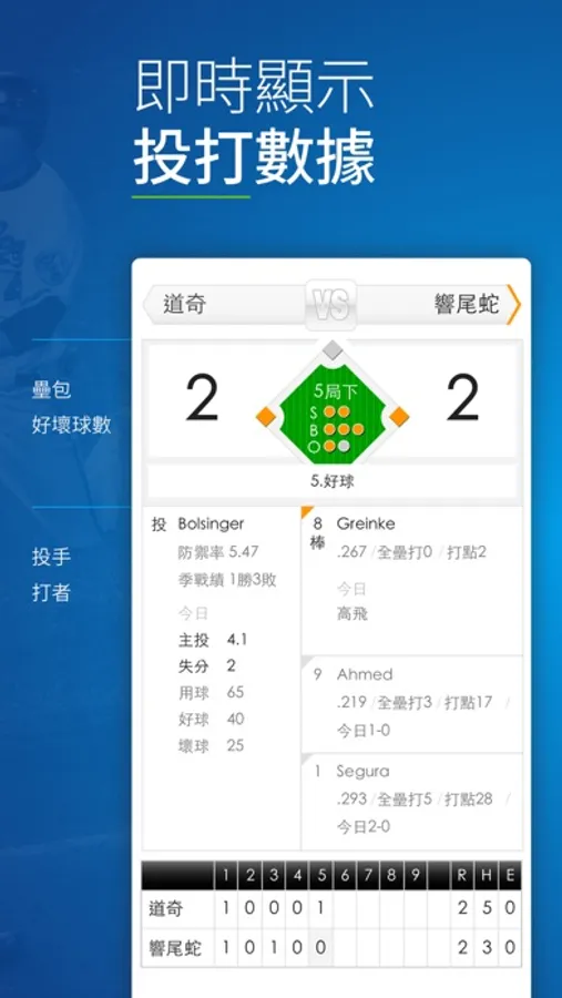 五、 詳細比賽過程:即時顯示文字轉播、投打數據、好壞球數、壘包狀況