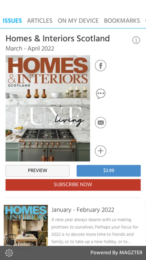 Homes & Interiors Scotland is a leading lifestyle publication featuring beautiful interior-designed homes and cutting-edge architecture. The 270-plus page, award-winning title leads in its trends' coverage, from the latest wallpaper, paint and fabric to furniture, food and gardens – complemented by sharp, informative writing. Work by both flourishing and established artists and makers is included to reflect the country's creative landscape. Homes & Interiors Scotland is an invaluable design and cultural source book, intent on spreading the word. Inside this app you can subscribe to Homes & Interiors Scotland (published bi-monthly), you can also purchase current and back issues and download free supplements. One year subscription is £17.99 (automatically renewed until cancelled). Single issues are £3.99. Your subscription automatically renews unless auto-renew is turned off at least 24-hours before the end of the current period. Your iTunes account will automatically be charged at the same price for renewal within 24-hours prior to the end of the current period (unless you change your subscription preferences in your account settings). You can manage your subscription through your account settings after purchase on your device. No cancellation on the current subscription is allowed during the active subscription period.
