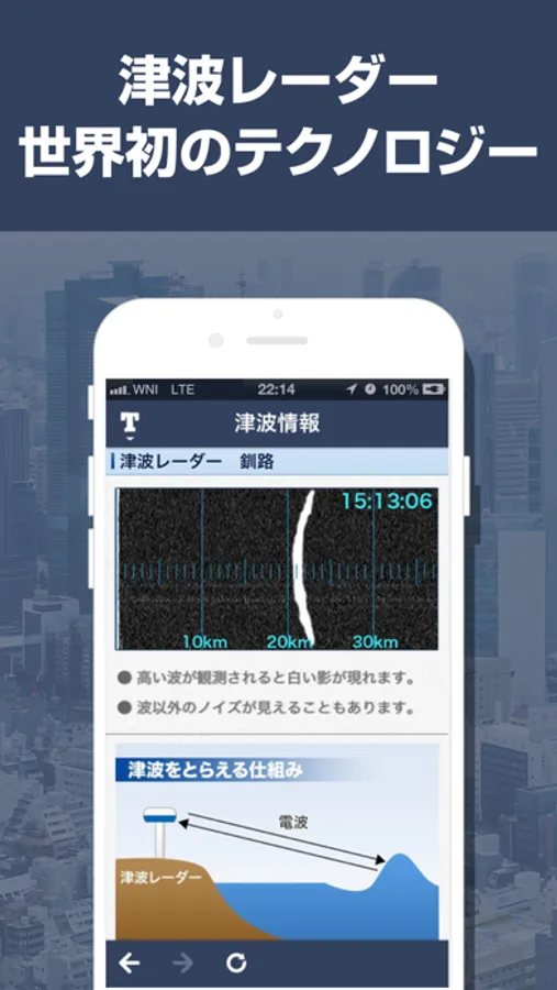 ウェザーニューズでは、津波による被害軽減を目的として、津波を観測・捕捉する「津波レーダー」を独自で開発。その津波の観測データを元に、大きな津波が発生した場合、その接近や到達を視覚化し、防災・減災にお役立ていただけます。