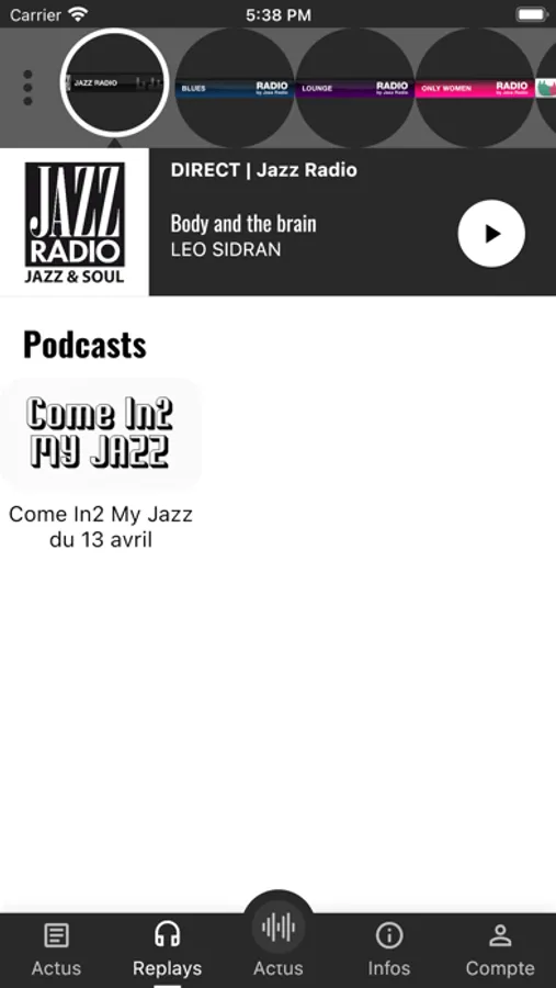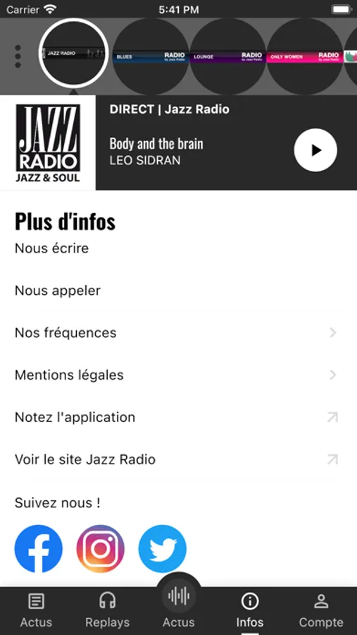 L’application Jazz Radio permet de retrouver toute la programmation unique de Jazz Radio qui allie à la fois les grands standards et les nouveautés Jazz & Soul. Vous pourrez également découvrir en la téléchargeant tous les courants du jazz à travers de multiples webradios ( Jazzradio Blues, jazz radio lounge, jazz radio stax and Motown…) et écouter des artistes tels que Diana Krall, Franck Sinatra, Marvin Gaye mais également des artistes francophones comme Ben l’Oncle Soul, etc…