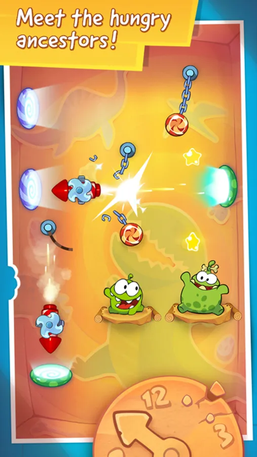 There’s no time to waste! Visit exciting locations including the Middle Ages, the Renaissance, a Pirate Ship, Ancient Egypt, Ancient Greece, the Stone Age, Disco Era, Wild West, Asian Dynasty, Industrial Revolution and the Future. Om Nom’s ancestors are waiting – and they’re getting really hungry for candy!