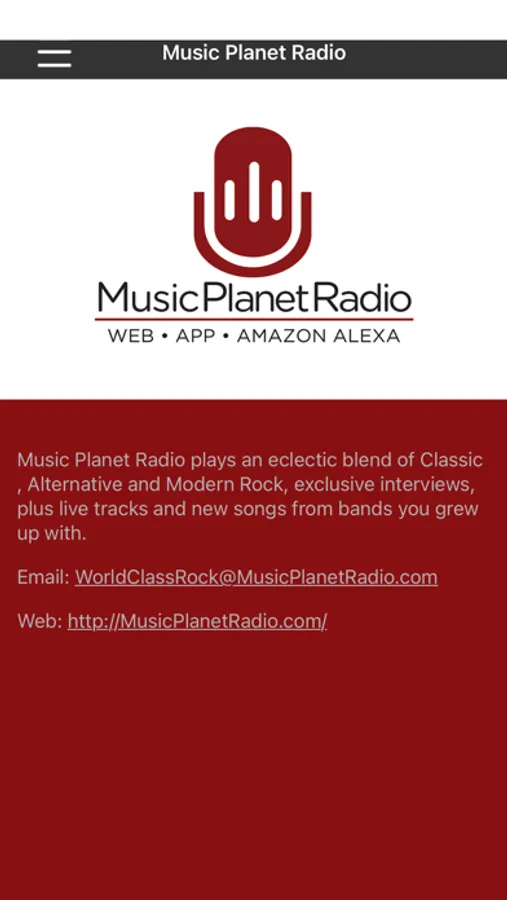 Hear great music 24/7/365 with the Music Planet Radio App! We play an eclectic blend of Classic, Alternative, and Modern Rock, exclusive interviews, plus live tracks and new songs from bands you grew up with. Specialty Shows include Chill@8, Big Red's Rock Show, Main Street, Visionaries, and more!