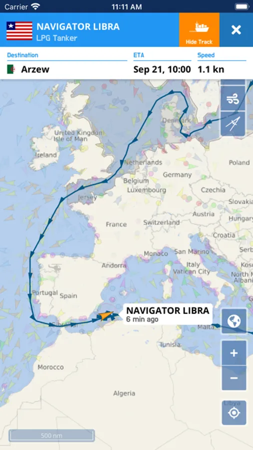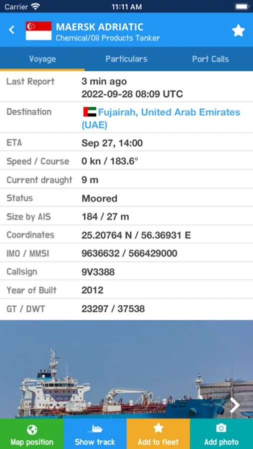 - Ship details - name, flag, type, IMO, MMSI, destination, ETA, draught, course, speed, gross tonnage, year of built, size