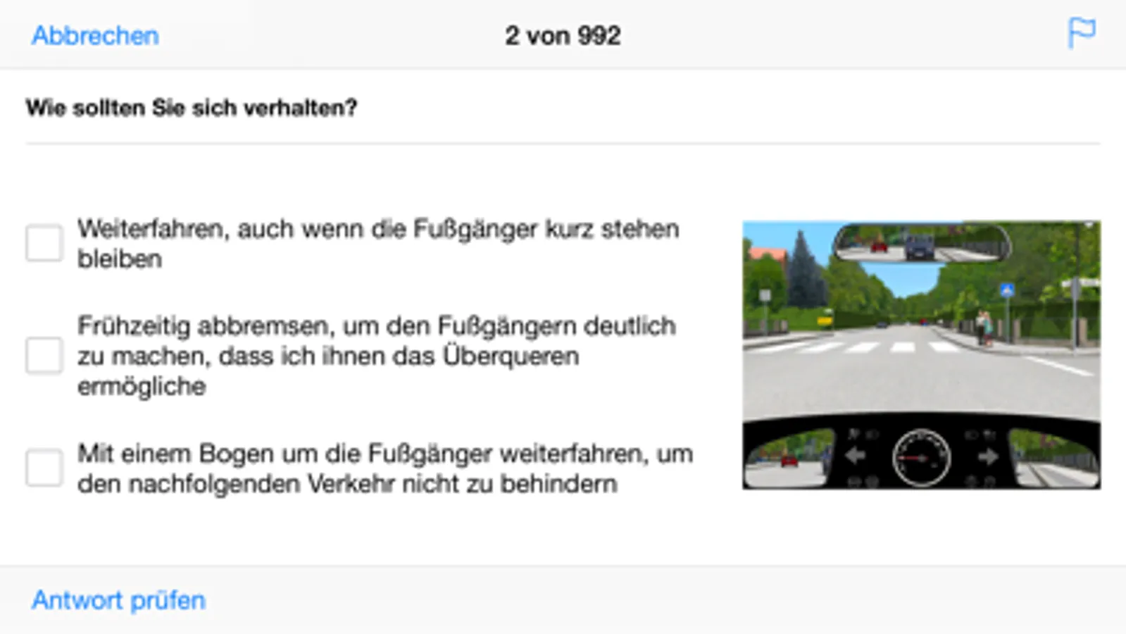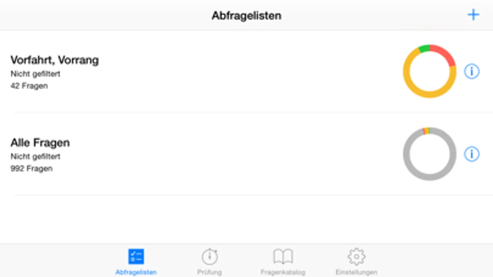 Geübt wird mit den originalen Prüfungsfragen. Diese kann man alle auf einmal bearbeiten oder nach Themengebieten. Fragen, die man bereits kann, werden auf Wunsch herausgefiltert. Eine grafische Anzeige gibt Auskunft über den aktuellen Kenntnisstand.