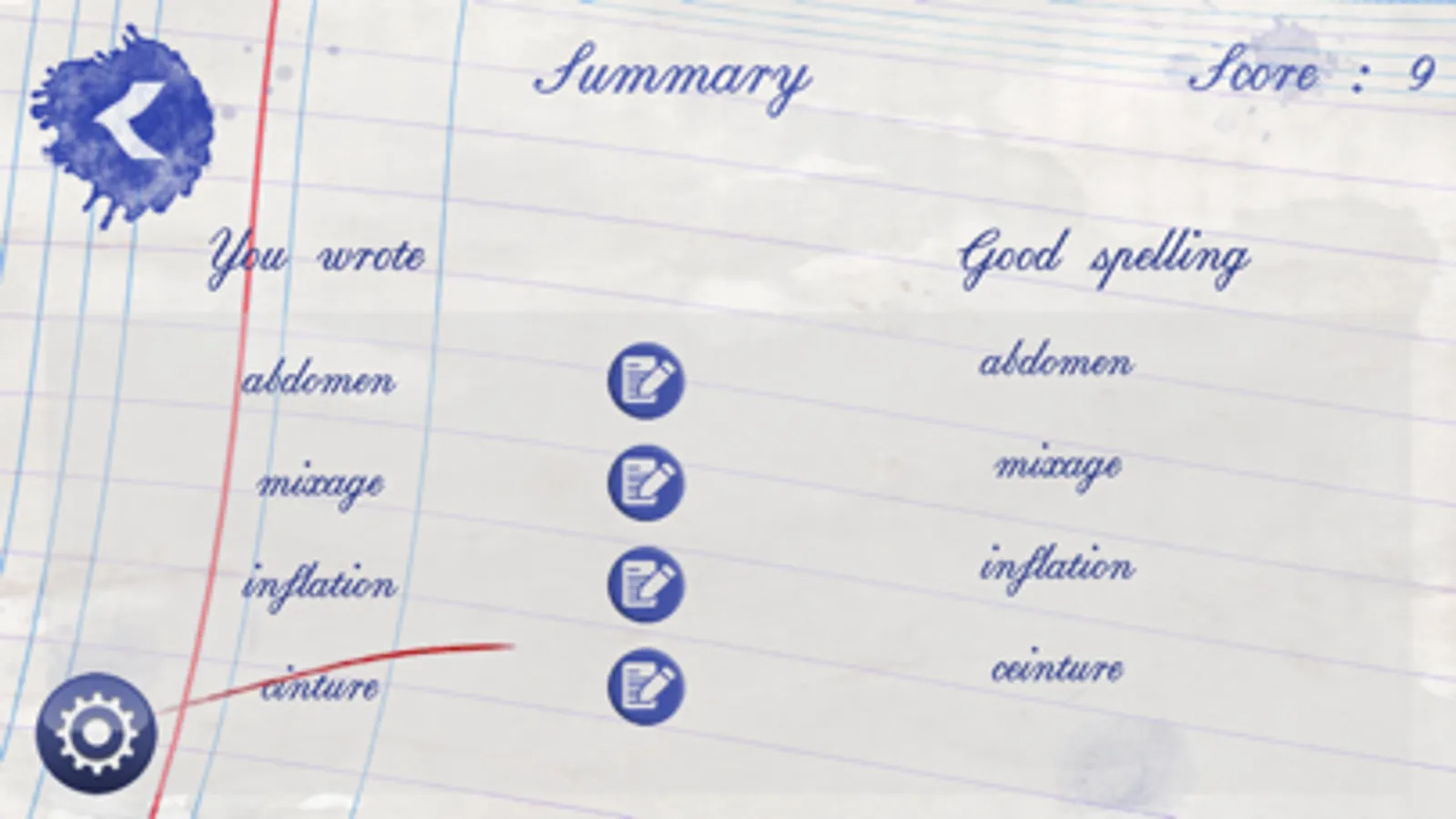 You can test your spelling in the different available game modes: spell properly as many words as possible in a limited time in the "Standard" mode ; spell as many words as possible one after the other without any mistake in the "Straight" mode.