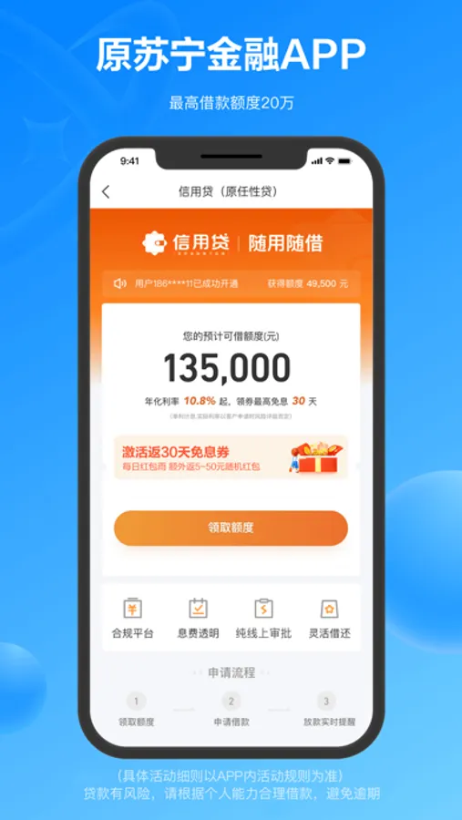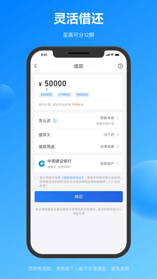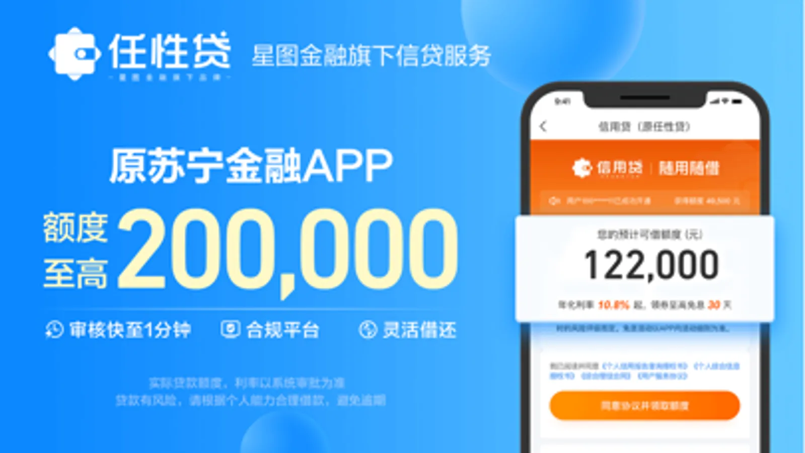 任性贷借款额度至高20万,灵活分期,审核快至1分钟,合规平台,信息安全,息费透明,年化利率10.8%起(单利),实际借款额度、通过率、利率以客户申请时的风险评级而定。即日起至2023年6月30日,首次申请开通任性贷的用户,开通成功随机返30天借款优惠券(随机再送5~50元无门槛支付券);任性贷已开通用户可参与抽奖赢50000元任性贷专属额度(需保证账户开通且正常使用)、20000元任性贷专属额度、7天借款免息券、2%任性贷还款返现券、随机金额支付券(0.1元~88元);以上活动每种奖品数量有限,发完即止,支付红包及优惠券可至星图金融APP-我的-权益包查看;具体活动细则以APP内展示为准。请根据个人能力合理贷款,避免逾期。