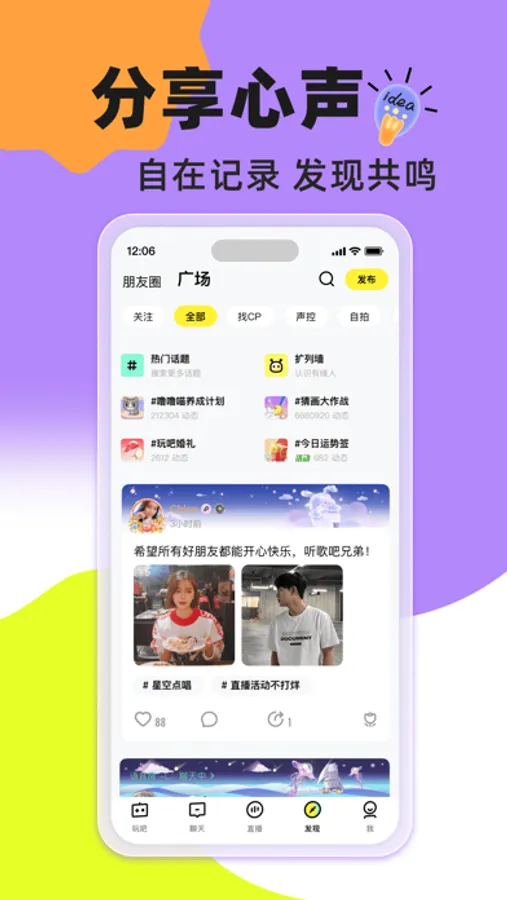 玩吧APP是当下非常流行的交友新方式,通过组局玩法、多人互动、话题共鸣,发现更多有趣的灵魂,把无聊变有聊,把尬聊变互撩!