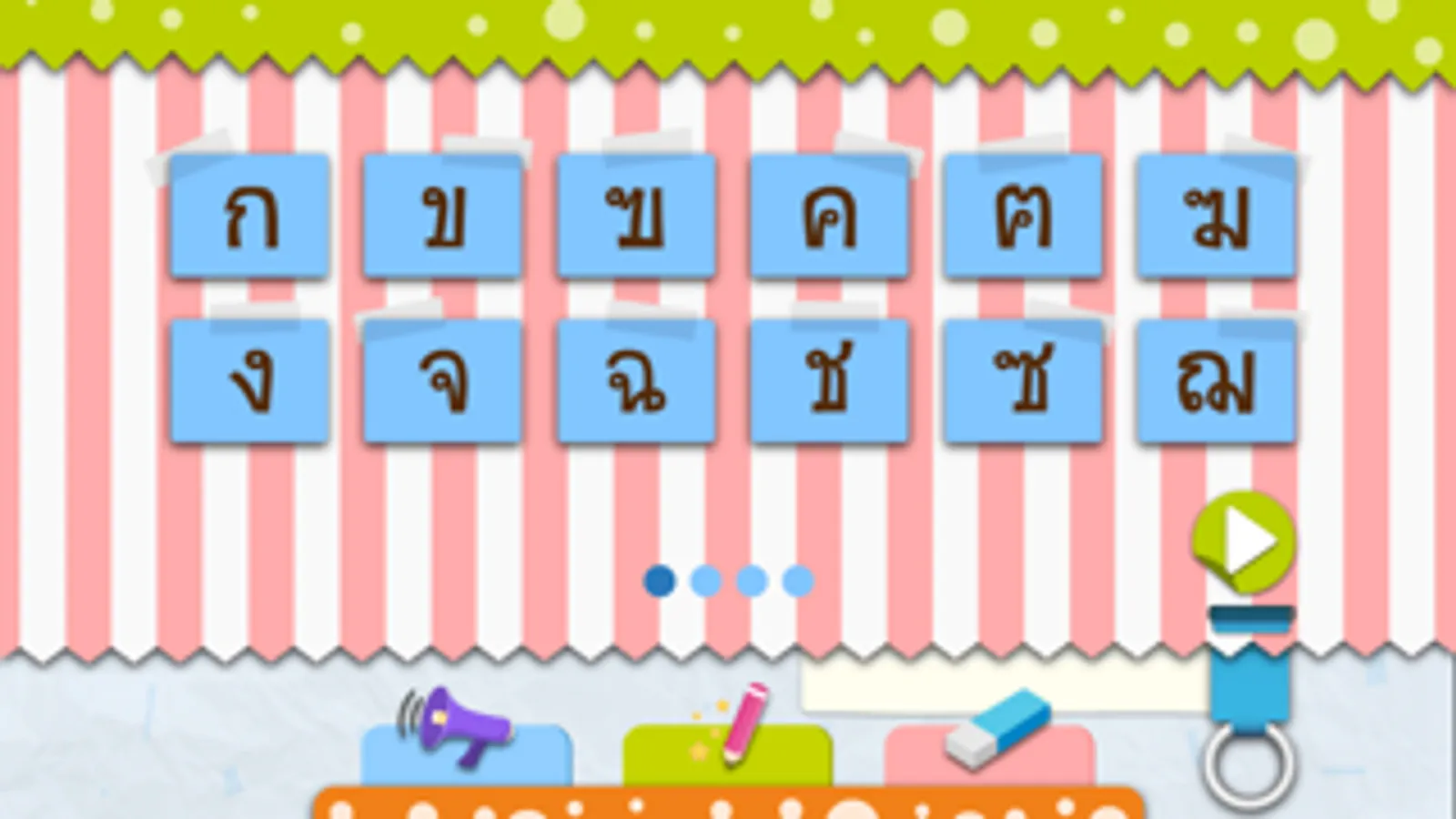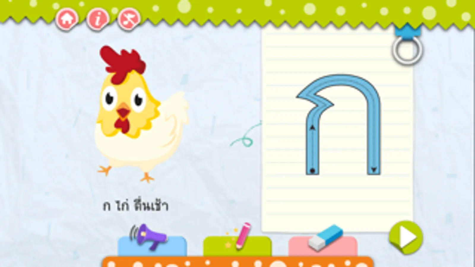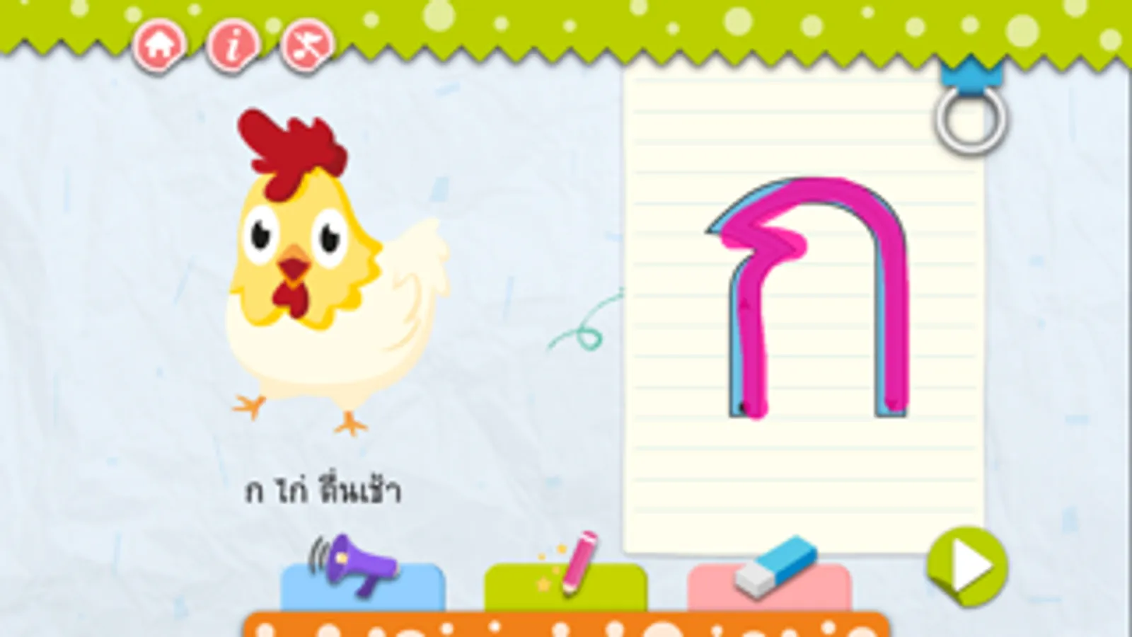 + Enjoy learning Thai alphabets (ก-ฮ, ko kai - ho nok huk) in rhyme to help children accustom themselves to memorizing and alphabetizing the letters correctly.