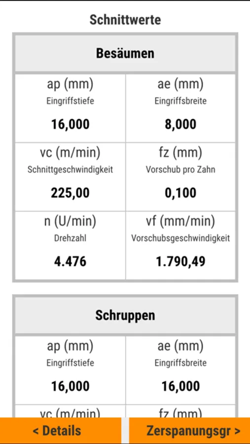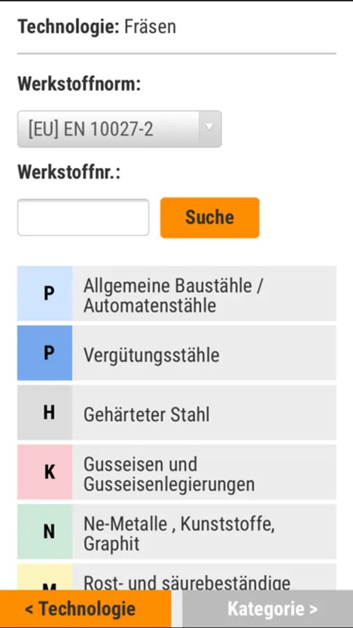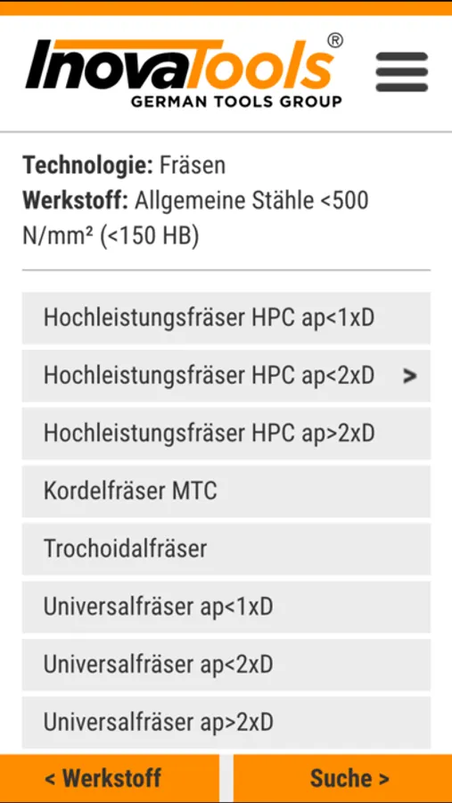 First you are to choose either milling, drilling, reaming or tapping. Then you are asked to select a material category from a provided list, or you can type in your material based on a pulldown window that contains several international material norms.