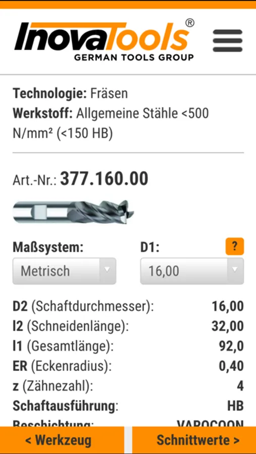 The INOCUT Cutting Data app provides you with your starting speed and feed recommendations, which are calculated from the selections you make as you are walked step by step through the app.