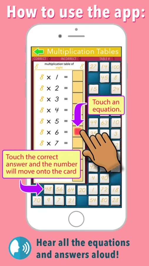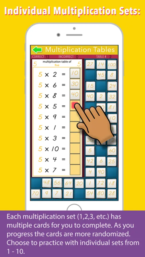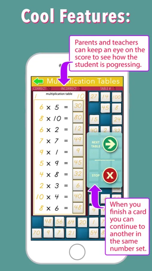 In a subtle way, the app keeps track of the child's progress, so parents and teachers can review their activity. Children can cycle through as many table cards as they choose in a random fashion.
