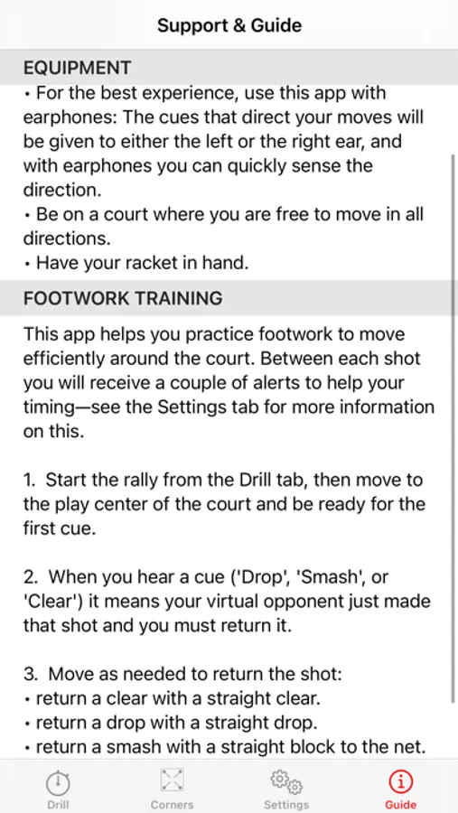 You will hear directions to move to seemingly randomly selected corners of the court, then return to your play center. You can select the pace, so you can focus on getting the footwork right. Ideally, you should use this on a real badminton court, with racket in hand. A smaller space may work if necessary.