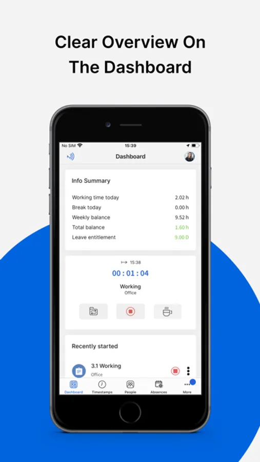 Work hours tracker records time live or subsequently. When you clock in and out, pause or stop the working hours tracking in the app, timestamps are automatically saved in your timesheet, providing a work log overview. In Project Time Tracking, employees can book time for separate tasks, projects or customers.