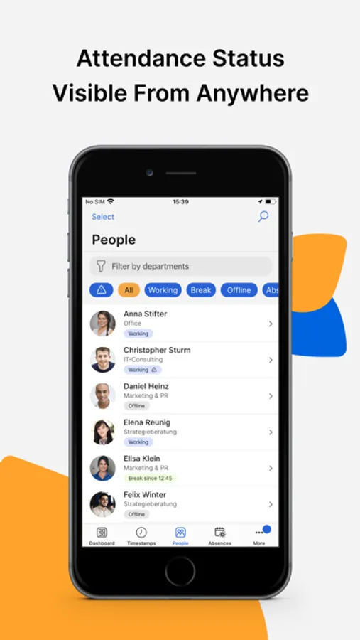 Who is currently working on which task, absent, or working remotely or from the office today? In the status overview, you can see live working time and employees' absences. It is especially interesting for managers and facilitates time management for teams.