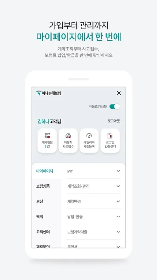 하나손해보험 고객님들께 필요한 보험관련 서비스를 언제, 어디서나, 스마트폰과 태블릿PC를 통해서