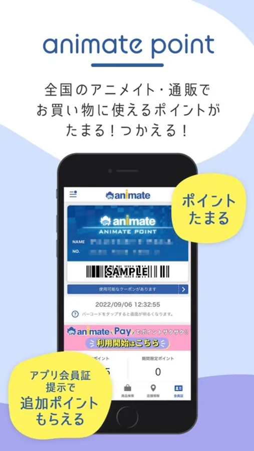 店舗でのお会計の際ご提示いただくと、商品代金(税抜)に応じてアニメイトポイントが還元されます。貯まったポイントは「1ポイント=1円」として次回以降お使いいただけます。