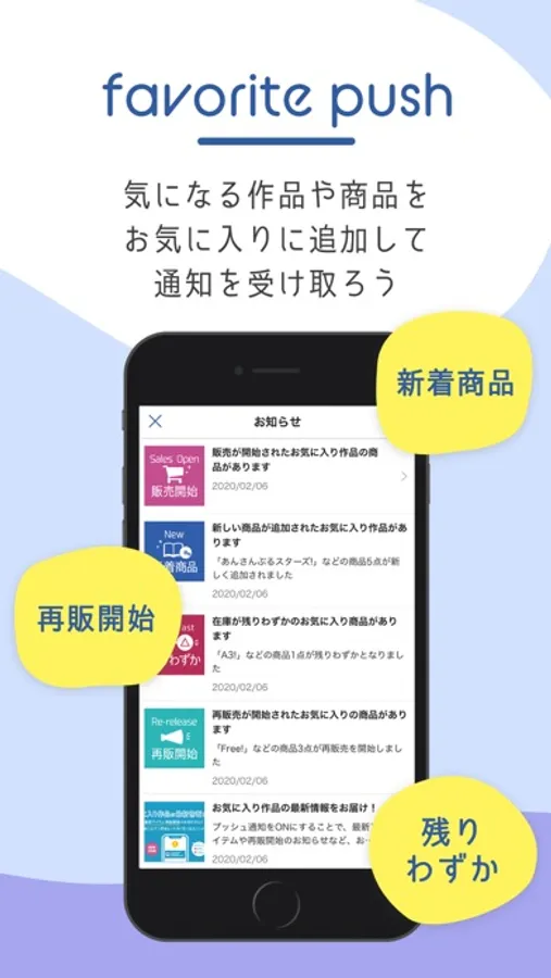 お気に入り機能といっしょに使うことで、お気に入り作品の新着アイテムや再販受付開始をプッシュ通知にてお知らせします。