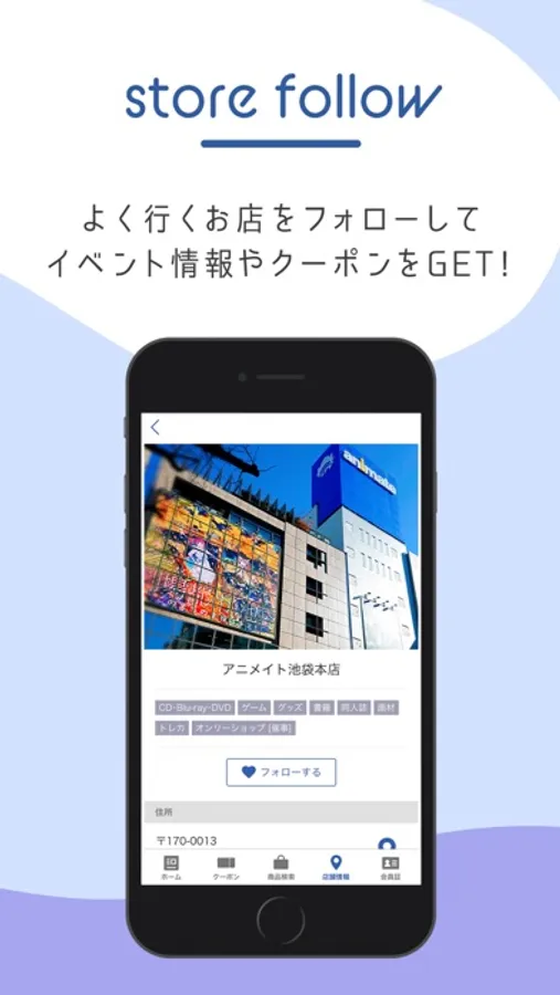 アニメイトアプリではアニメイトで取り扱っているグッズや映像商品、書籍などの最新情報をお届けするほか、お気に入りの店舗をフォローすることでフォロー店舗限定のクーポンや、イベント・フェアの開催情報などをお届けします。