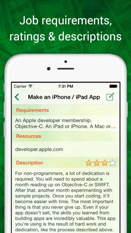 This app will change the way you think about what is possible on making money. We've done extensive research to make sure you have the best job resource you can find in the app store. We cover basic jobs, creative jobs and jobs that can generate passive income. Do you want to make an iPhone/iPad app too? We'll tell you how.