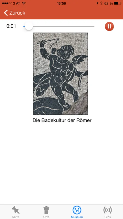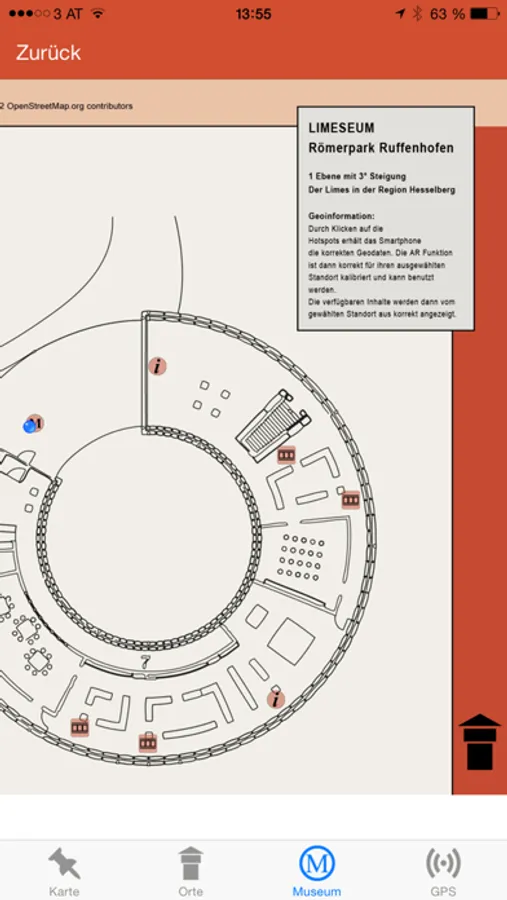 Im Museum können Sie sich mit Hilfe eines Planes orientieren. Die Applikation stellt zusätzliche Informationen zu den Fundstücken im Museum bereit. Ziel ist unter anderem die Verknüpfung von Fundort und Fund. Alternativ wird auch eine Steuerung via AR im Museum angeboten.