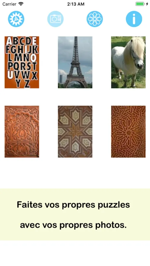 Résolvez des puzzles à partir des photos déjà dans l'application, ou à partir de vos propres photos.