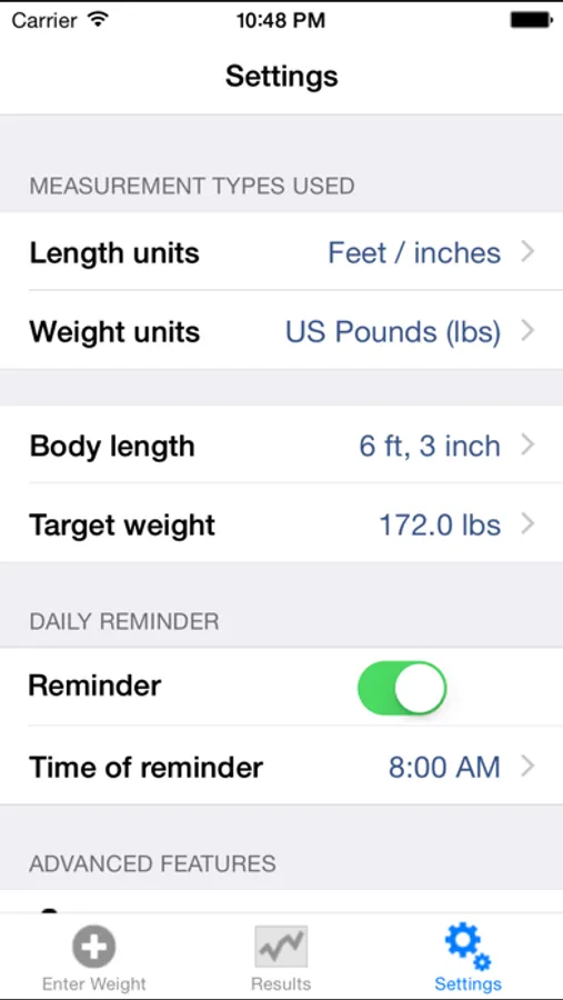 Your weight over time will be displayed in a graph. And your body mass index (BMI) and healthy weight range will be calculated based on your length. Additionally, you can set your personal target weight. All this will help you adjust your diet. You can also set a reminder that will notify you to track your weight every day!