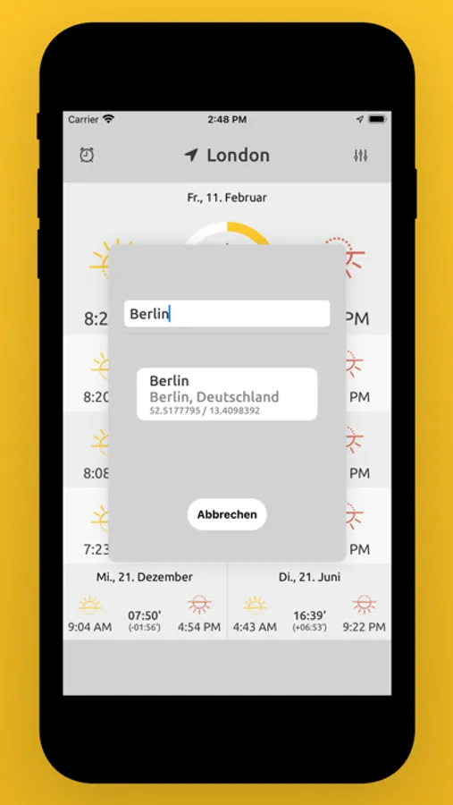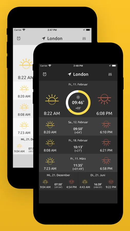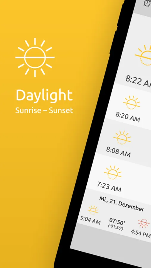 Shows you the sunshine hours as well as the sunrise and sunset times of your current location. Wherever you are.