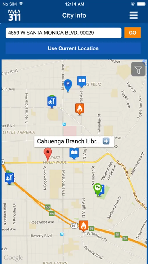 • Looking for the nearest park? Want to cool off on a hot day? Need to return a library book? The ‘City Info’ feature conveniently maps the closest parks, libraries, fire and police stations, golf courses, public pools, tennis courts, golf courses, parking lots, and more.