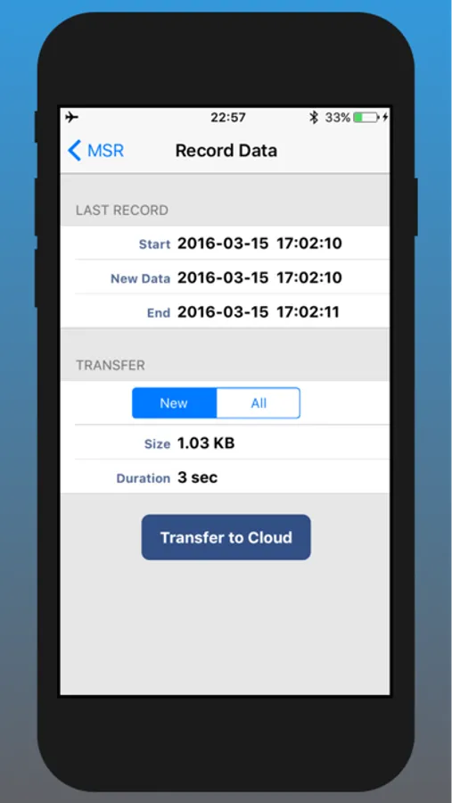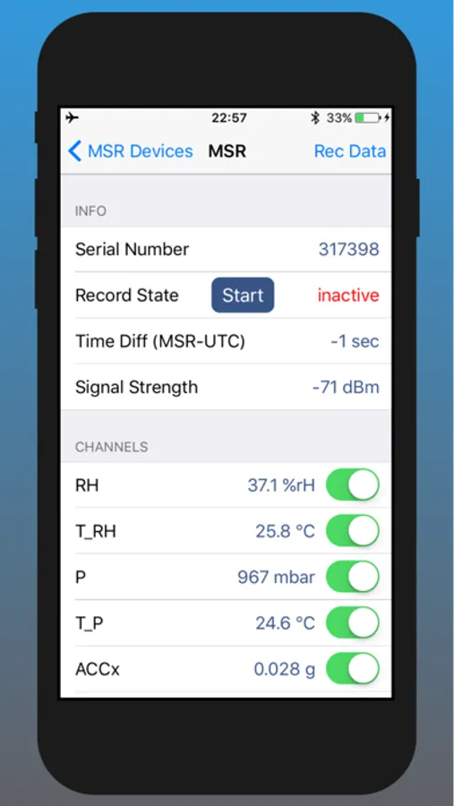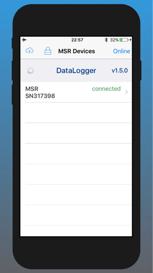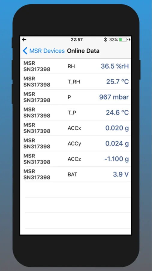 This application enables mobile devices to control MSR data loggers. It provides logger configuration and viewing online and record sensor data. Record data can be uploaded to MSR Smart Cloud. The mobile device connects to multiple loggers using Bluetooth Low Energy (BLE).