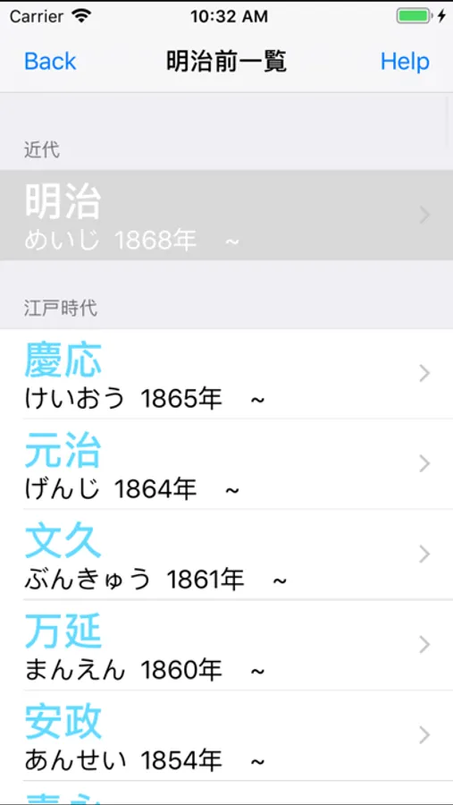 "明治前"キーをタッチし、年号一覧表に調べたい年号を選択すると、年号から検索と同じ操作です。