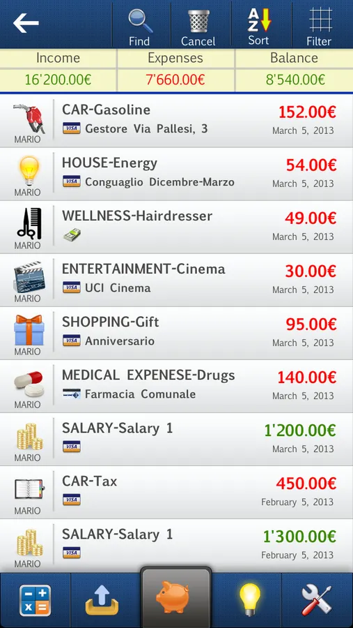 The visualization of the movements can be customized through the use of powerful filters fully customizable (by date, user, account, payment, category, subcategory, etc.)