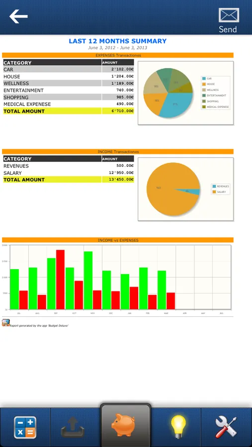A PDF format report exported by mail, summarizes in detail all expenses/revenue divided by category in the last 12 months.