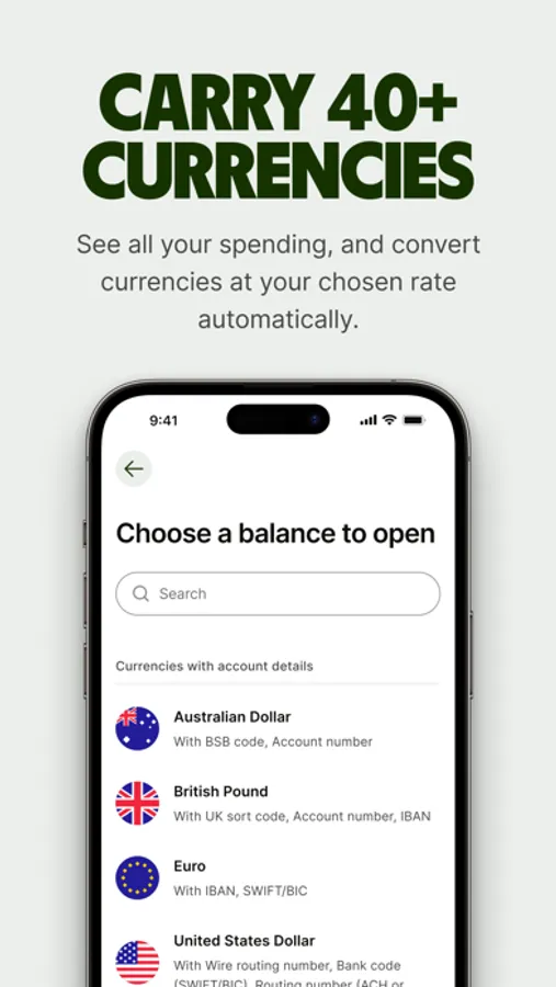 • Get your own UK account number and sort code, European IBAN, US routing and account numbers, and more. As if you had local bank accounts around the world.