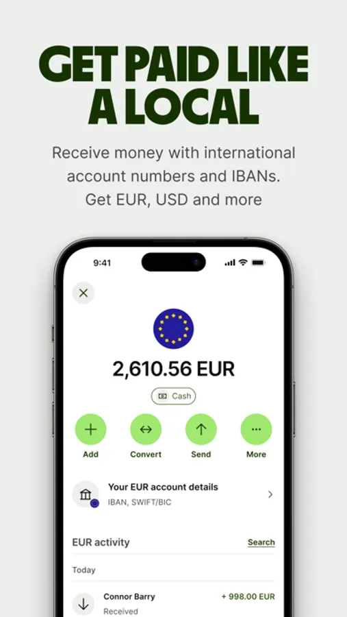 • Use these account details to get paid in multiple currencies for free, and for direct debits