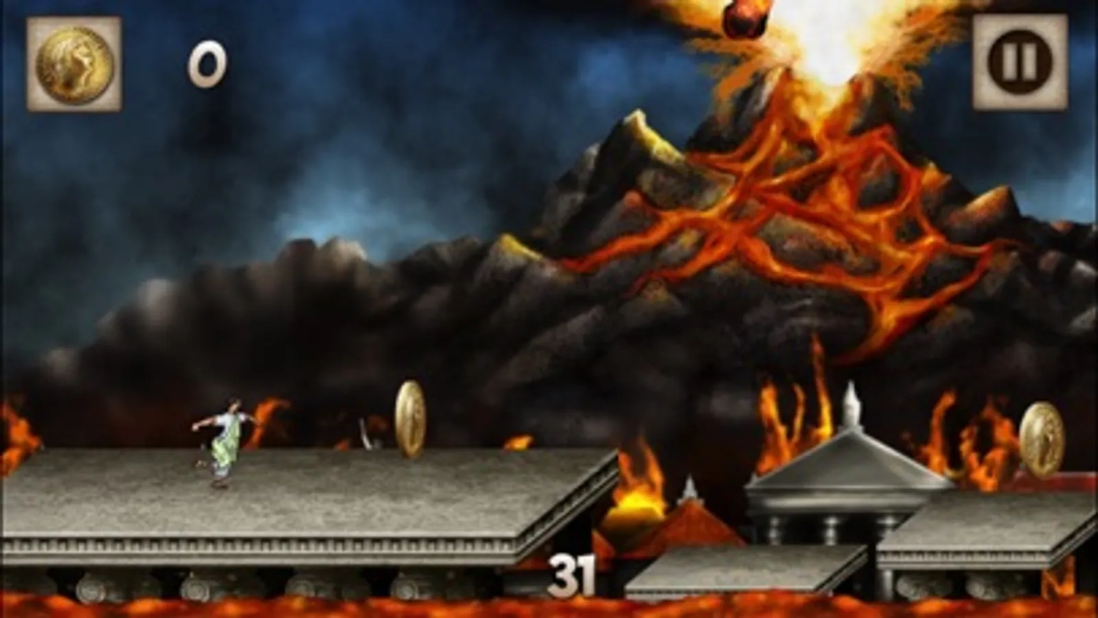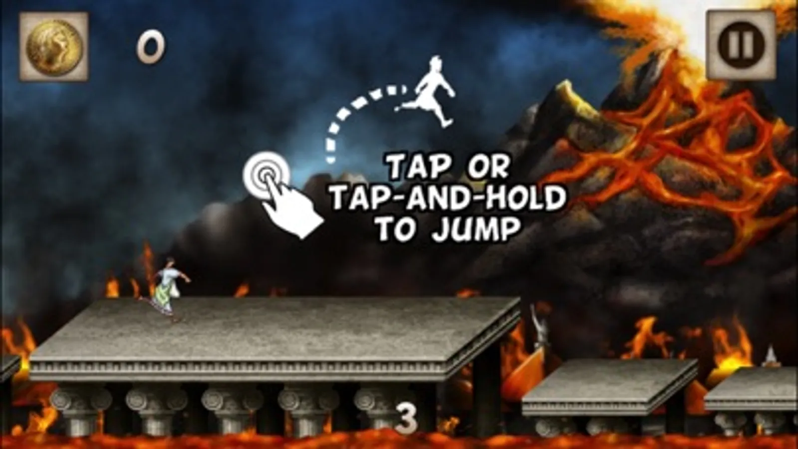 Run across pillars and on temple tops while you jump to different levels, escape falling volcanic debris, and leap over burning hot obstacles.