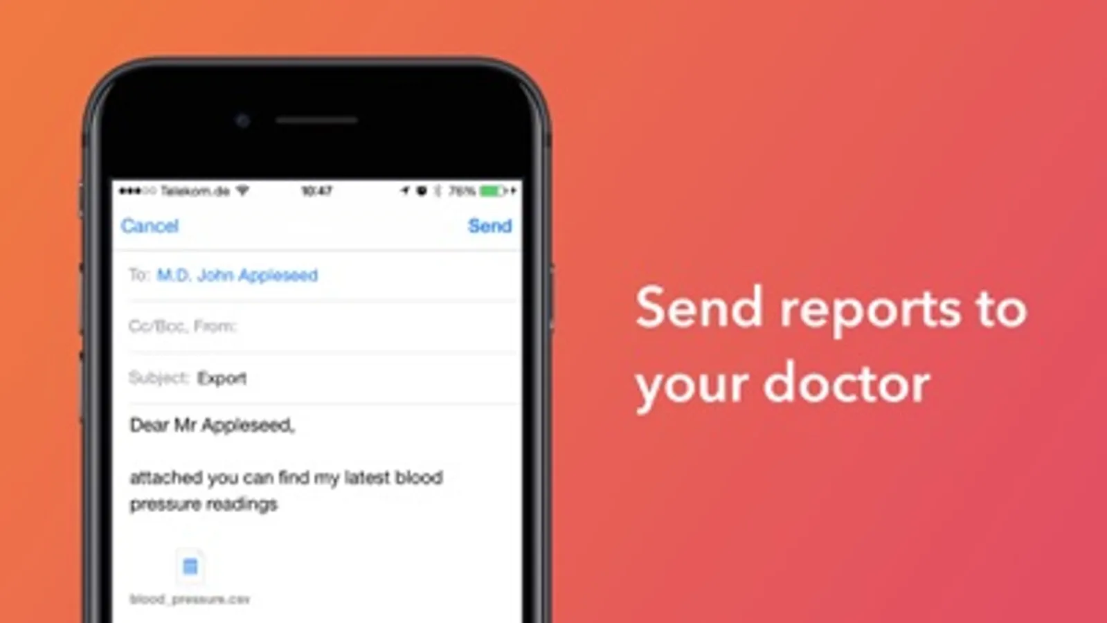Beautiful, handcrafted charts offer you a quick overview of the latest developments of your hypertension. However, you still have the possibility for deeper analysis: Thanks to built-in export capabilities, you can send all your data via e-mail to anyone you like.