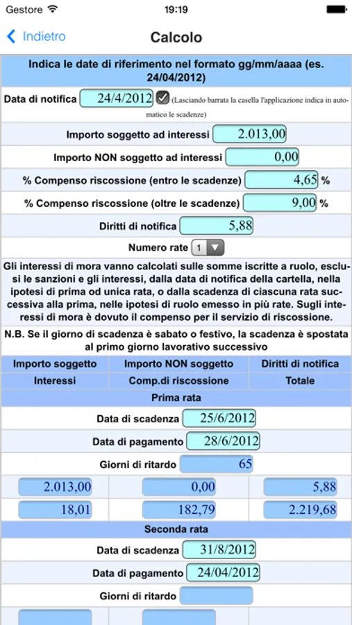 Questa applicazione permette di eseguire il calcolo degli interessi di mora su Cartelle di Pagamento relative a imposte fiscali e tributi locali, dovuti per versamento effettuato oltre la data di scadenza.