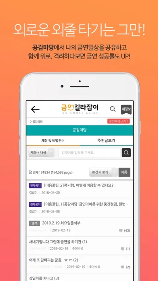 외로운 금연은 이제 끝! 공감마당에서 함께 금연해보세요. 금연 경험을 나눌 수 있는 커뮤니티 공간인 공감마당을 통해 조용히 시작했다가 조용히 끝내는 금연을 단절하고 서로 위로하고 칭찬, 조언하며 금연 성공할 수 있습니다.
