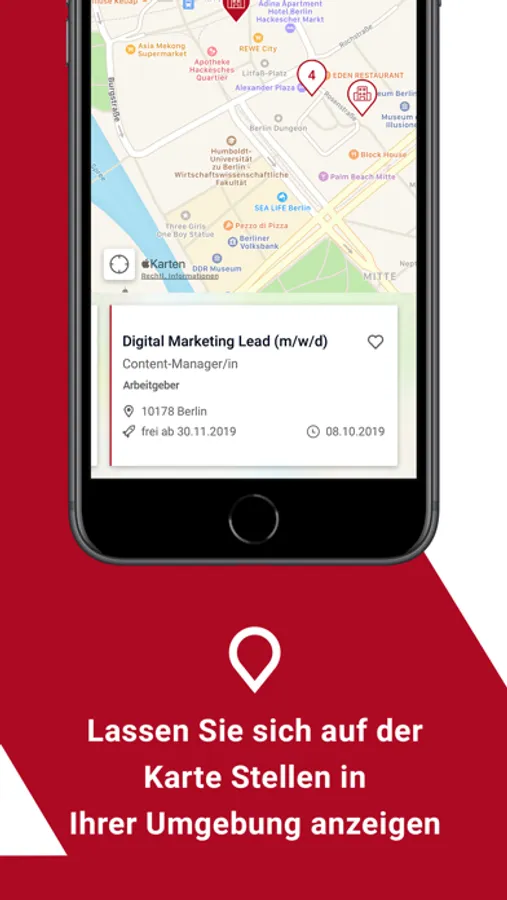 Außerdem können Sie per Standorterkennung gezielt nach Jobs in Ihrer Umgebung suchen und den Stellenmarkt erkunden.