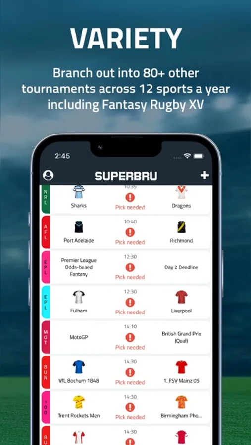 Superbru covers 80+ tournaments per year including the English Premier League, European leagues, Champions League, United Rugby Championship, Rugby Championship and much more. Football, rugby, cricket, golf, motorsport, rugby league, American football, Australian Rules, tennis, rugby sevens and cycling are covered.