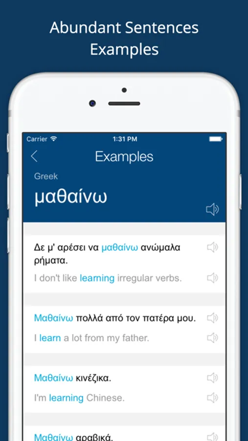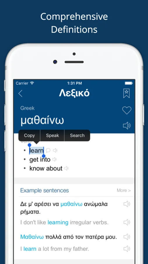 The Greek English Dictionary & Translator app enables you to search Greek & English words with definitions, examples, pronunciation, and more.