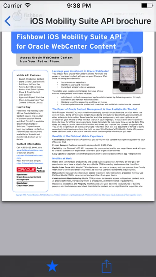 FishbowlToGo lets you easily find and view items from Oracle WebCenter Content (UCM) on your iPhone. Additional premium features include workflow review, check-in, and native file access.