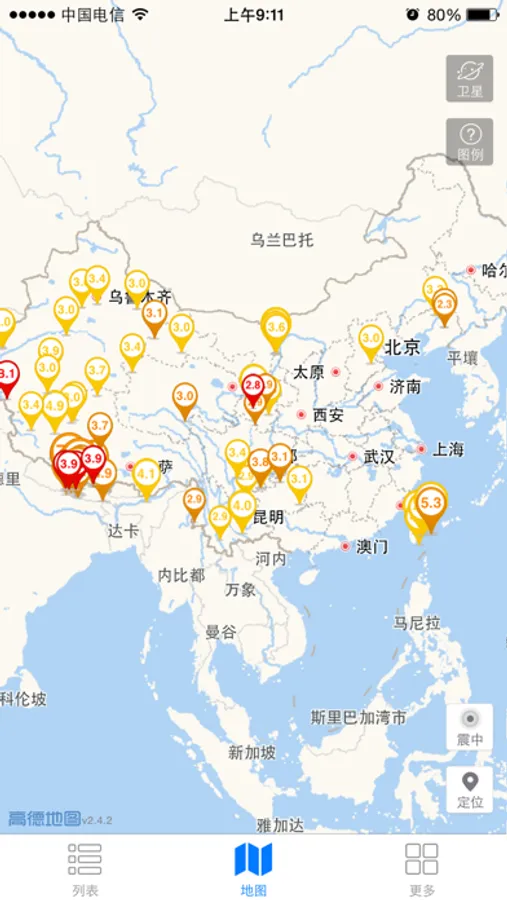 3、地震列表上的所有地震可以定位到地图上,震级大小和发震时刻通过标注符号区分;
