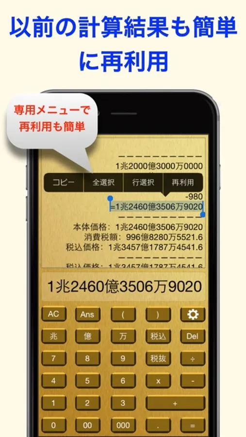 兆、億、万、00,000という専用キーを使うことで簡単に高額計算ができます。