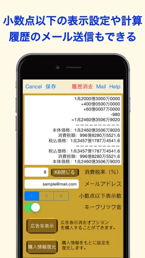歯車のついたキーを押すと設定画面に移行し、消費税率や、小数点以下の表示桁数の設定、履歴の確認とメール送信や消去ができるようになっています。
