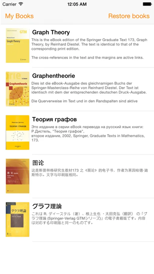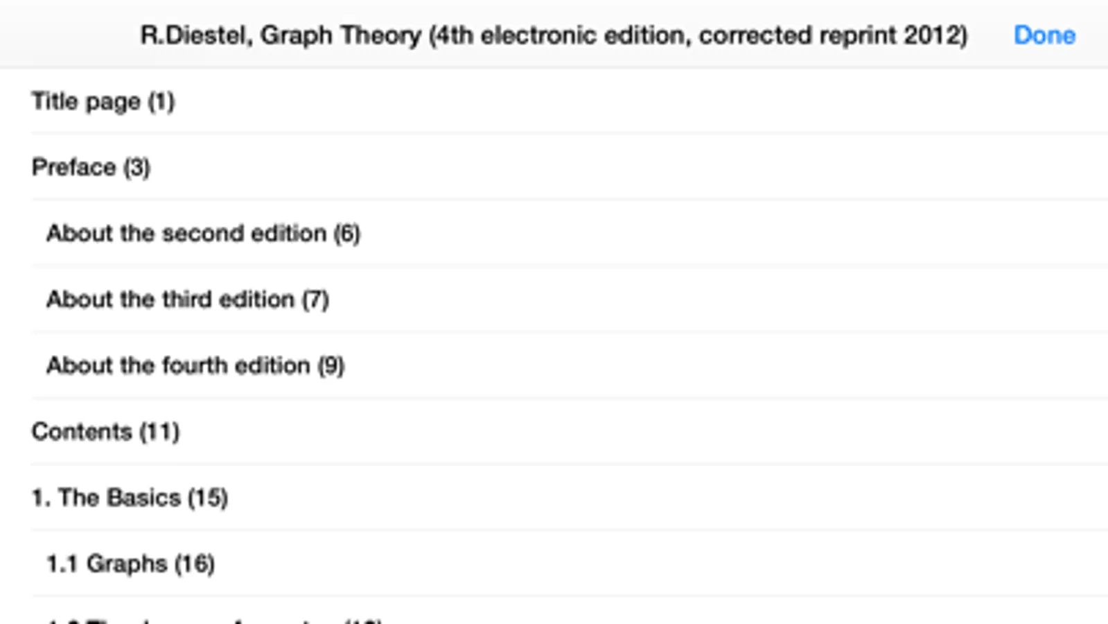 This app can download and display all the eBook editions of the Springer Graduate Text 173, Graph Theory, by Reinhard Diestel. The book is currently available in English, German, Chinese, Japanese and Russian.
