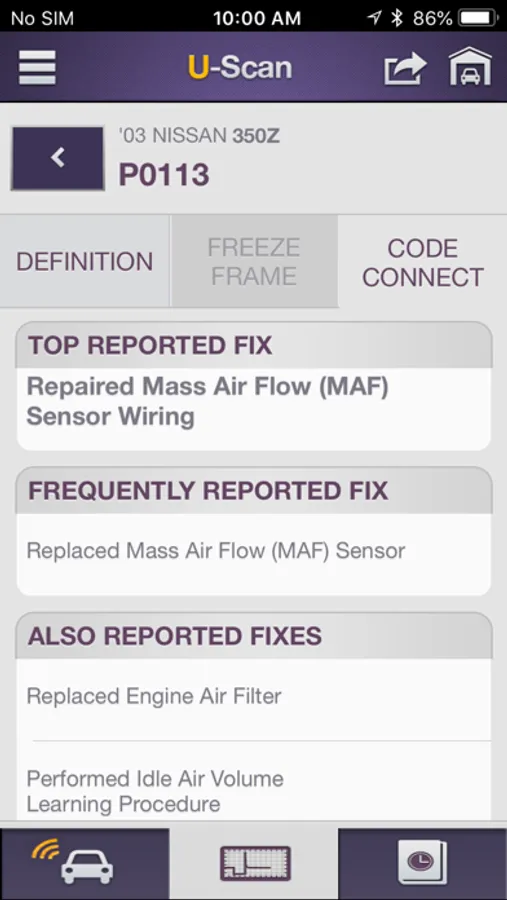 •Get the next step in diagnosing your vehicle. Access over 4.3 Million Fixes that tell you what is wrong with your vehicle with CodeConnect™. CodeConnect™ is a comprehensive database of over 4.3 million verified fixes for the trouble codes that cause the check engine and ABS warning lights to illuminate. These actual vehicle fixes have been reported and then verified by our team of ASE certified technicians.